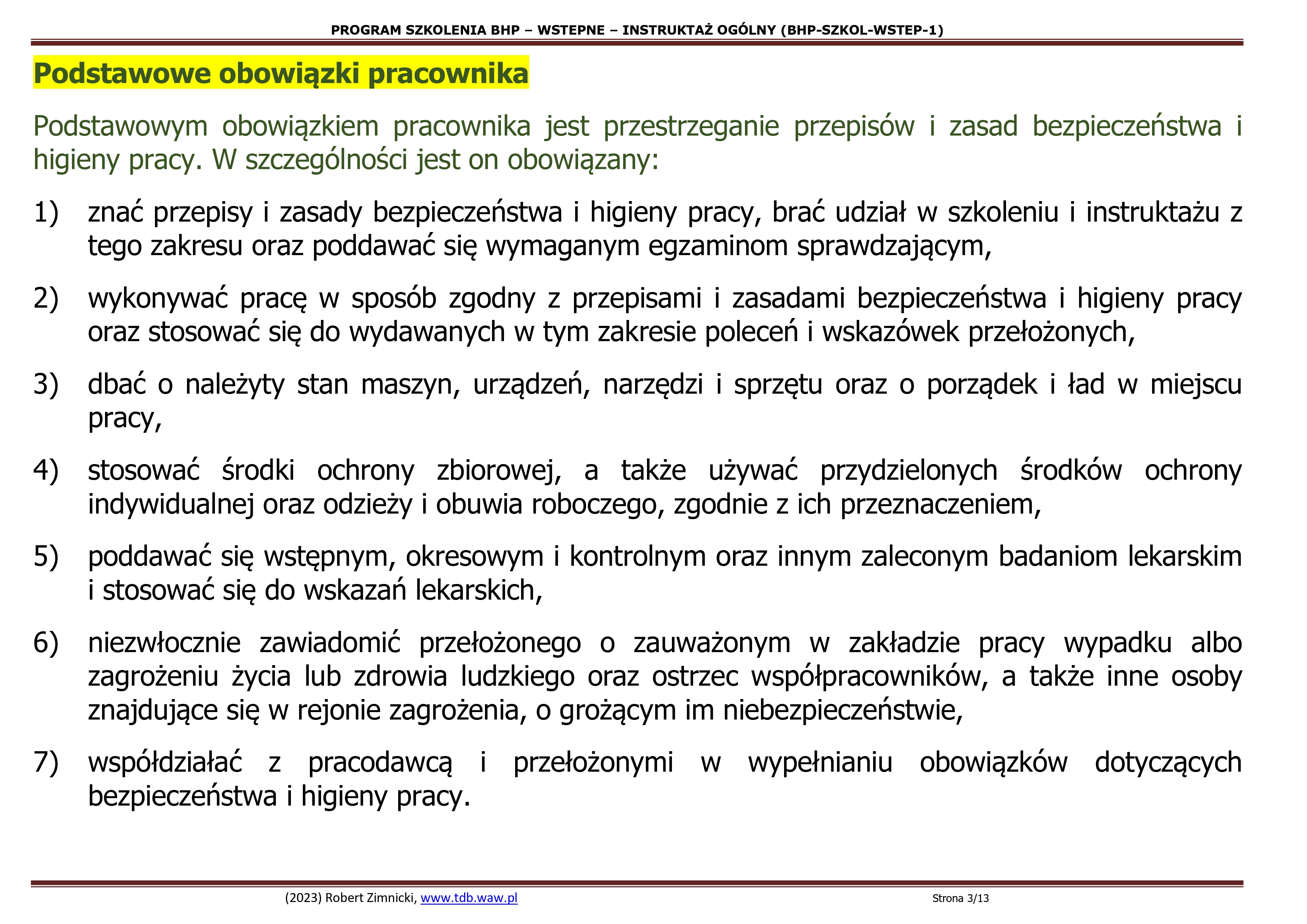 Cel kształcenia Cel instruktażu ogólnego w dziedzinie bezpieczeństwa i higieny pracy określony jest w załączniku Nr 1 do rozporządzenia Ministra Gospodarki i Pracy z dnia 27 lipca 2004 r. w sprawie szkolenia w dziedzinie bhp (Część I). Zgodnie z postanowieniami ww. rozporządzenia celem instruktażu ogólnego w dziedzinie bhp jest zaznajomienie pracownika w szczególności z: